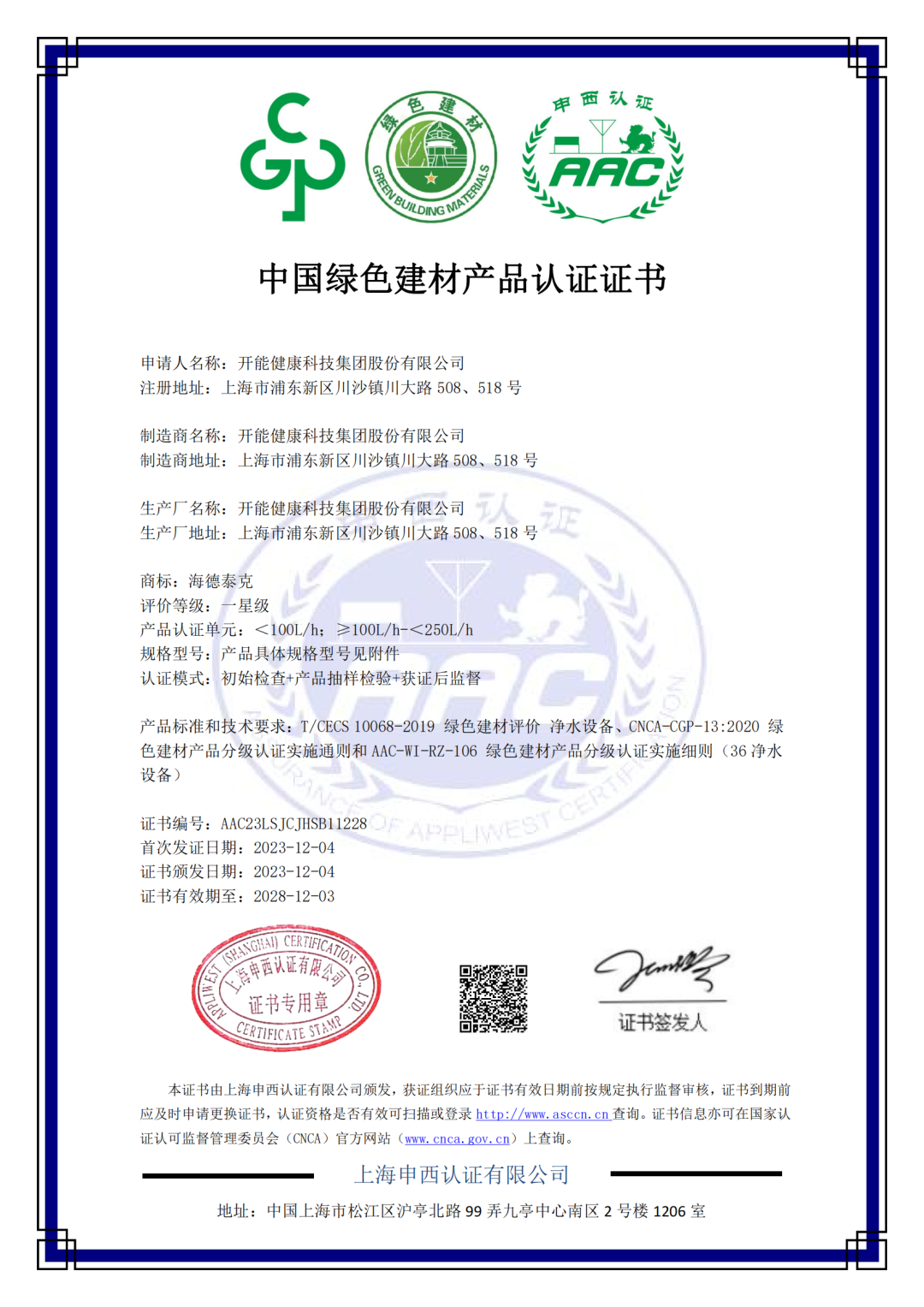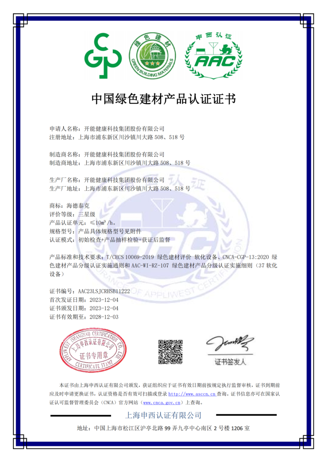 開能健康一直以來都秉持著“綠色、環保、健康”的理念,助力建材行業綠色發展,經過認證中心專家組的嚴格評審,審核范圍涵蓋產品品質、管理體系、廠區環境、研發設計、生產管理、工藝技術等多方面內容,對原料供應、生產制造、產品性能、能耗及發展方面等展開層層篩查,順利通過并獲得中國綠色建材產品認證證書。其中開能生產的軟水機產品獲得三星級“中國綠色建材產品認證證書”,該級別是“中國綠色建材產品”分級認證中的最高等級。