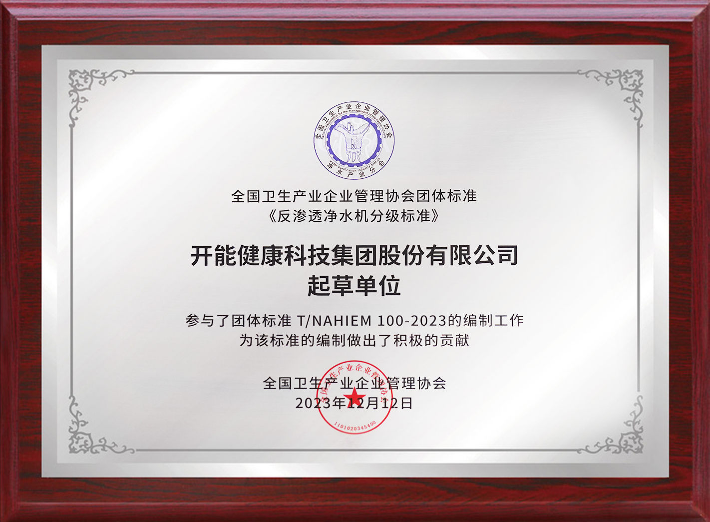 作為全屋凈水的先行者,開能集團始終專注于水處理產品的研發與制造,為了進一步規范凈水機產品質量水平、引導行業技術創新,開能集團參與全國衛生產業企業管理協會團體標準起草工作組,并擔任《家用和類似用途軟水機分級標準》組長單位,為規范凈水行業發展積極貢獻自己的力量。