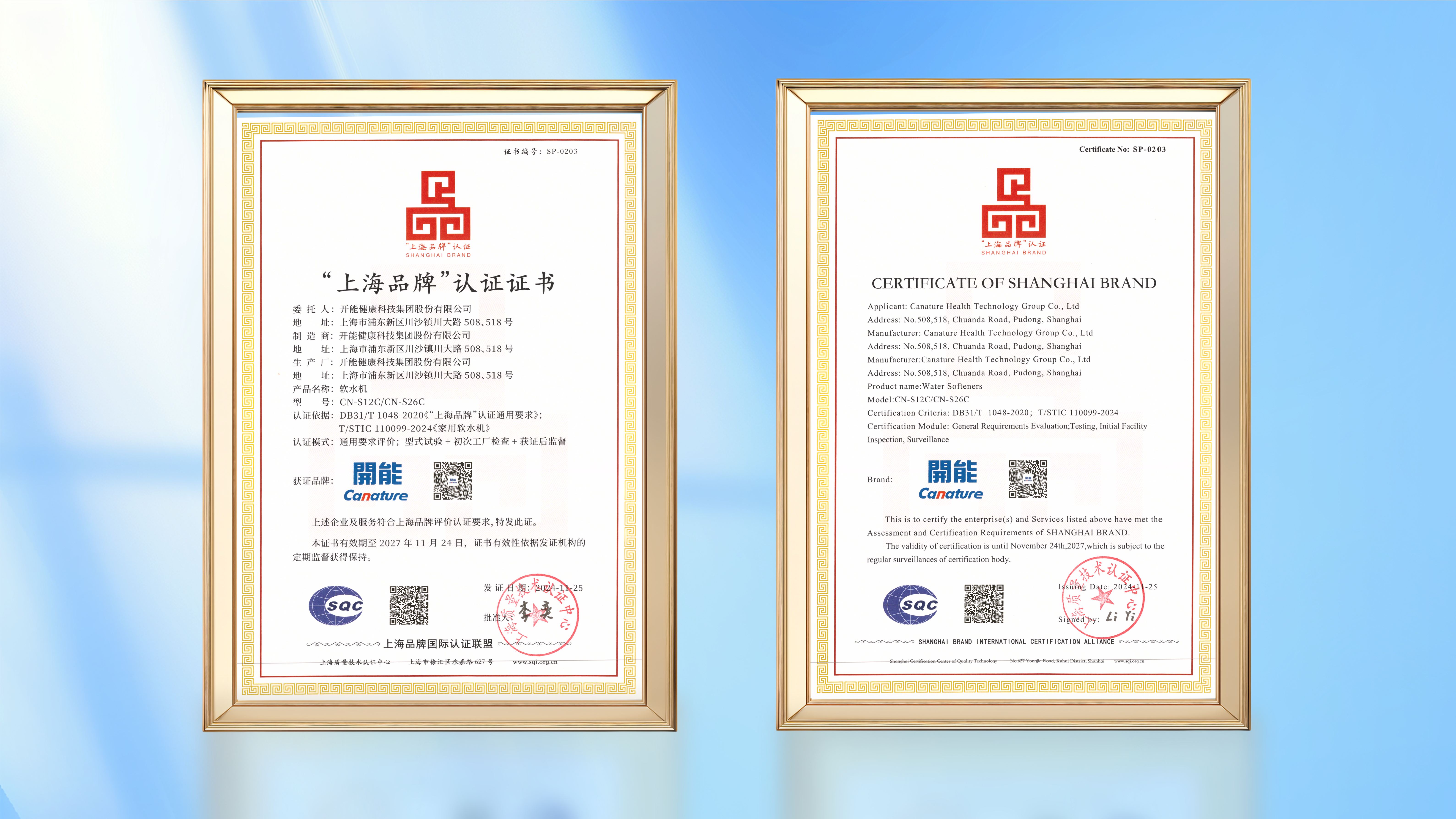 2024-11-29日前,開(kāi)能健康科技集團(tuán)股份有限公司(以下簡(jiǎn)稱“開(kāi)能健康”)申報(bào)的開(kāi)能CN-S12C/CN-S26C軟水機(jī)產(chǎn)品獲得“上海品牌”認(rèn)證,證書由上海質(zhì)量技術(shù)認(rèn)證中心簽發(fā)。